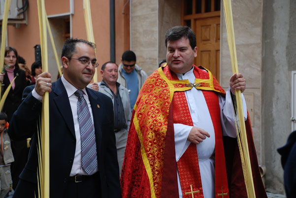 La Procesión simboliza la entrada triunfal de Jesús en Jerusalén, por ello comienza con la bendición de las palmas y las ramas de olivo, el rojo característico del día representa a Jesús como Rey.